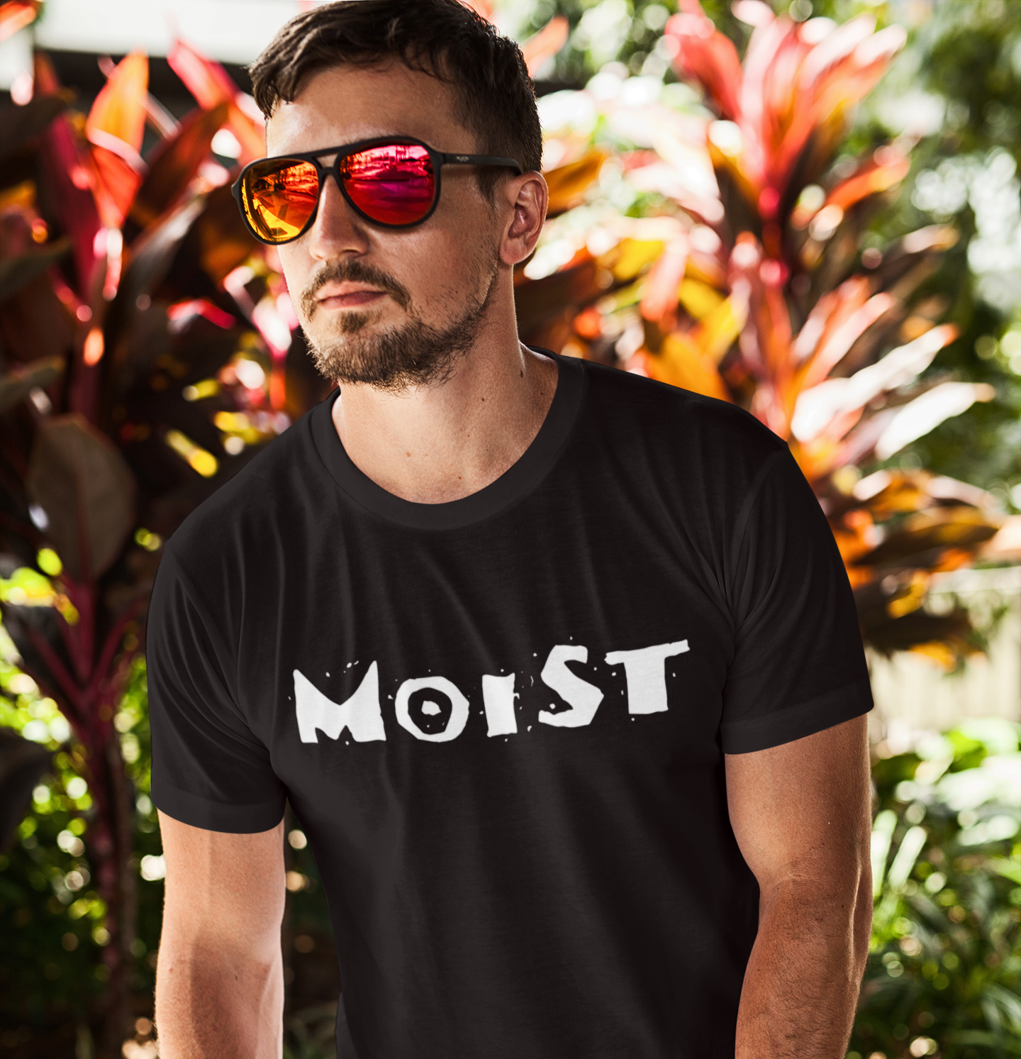 • Man wearing a black t-shirt with 'MOIST' text, standing outdoors with plants in the background